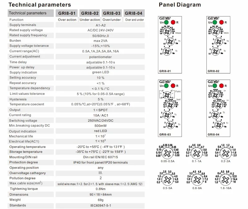 Thông số kỹ thuật chính rơ le giám sát dòng điện - bảo vệ quá dòng GRI8-01